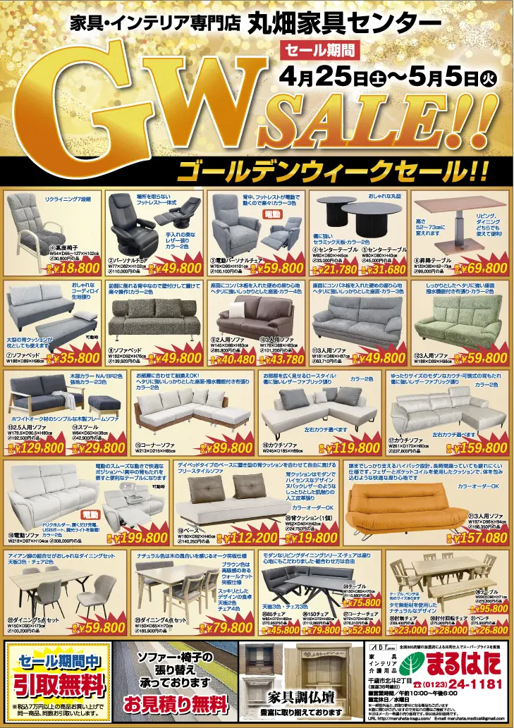 家具・インテリア専門店の丸畑家具センターではゴールデンウィークセールを開催いたします。